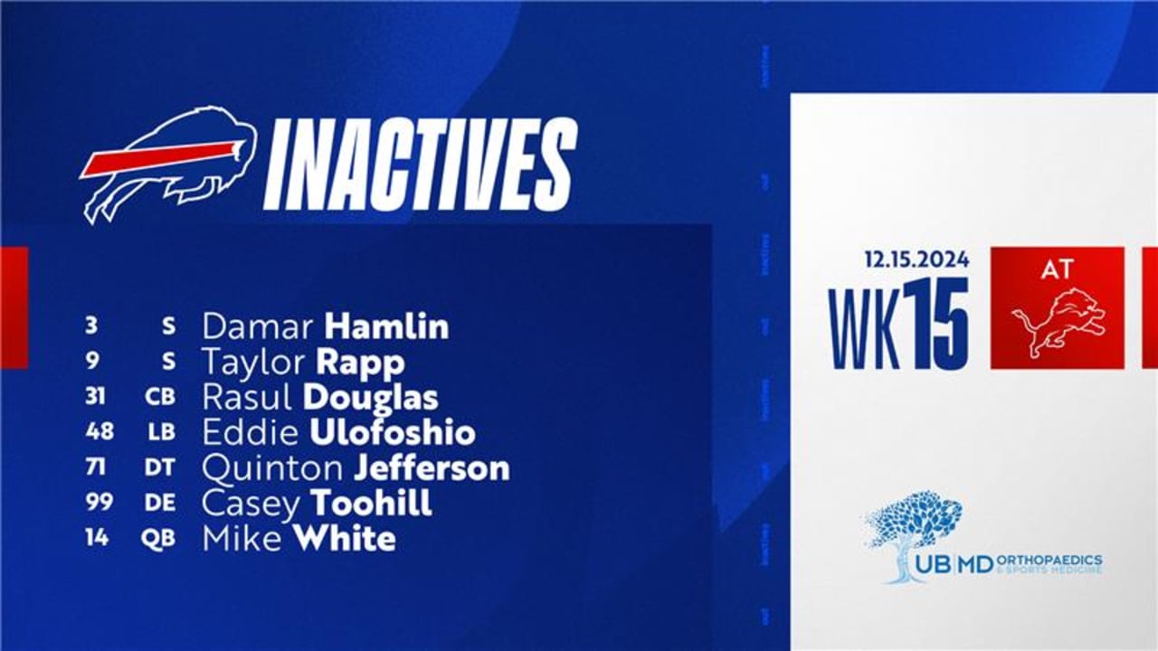 With Hamlin and Rapp out, the Bills will be without both of their starting safeties. Buffalo has rookie S Cole Bishop, S/CB Cam Lewis on the active roster; they also elevated S Kareem Jackson from the practice squad for today’s game.